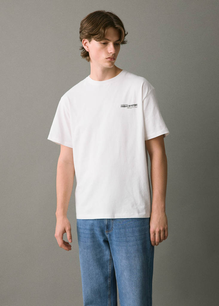 Изделие прямого кроя из 100% хлопка с круглым вырезом и короткими рукавами. Отличается принтом на спине и надписью спереди