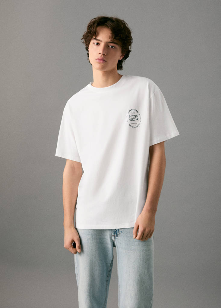 Изделие прямого кроя из 100% хлопка с принтом. Текст расположен спереди,, а рисунок — сзади. С круглым вырезом и короткими рукавами