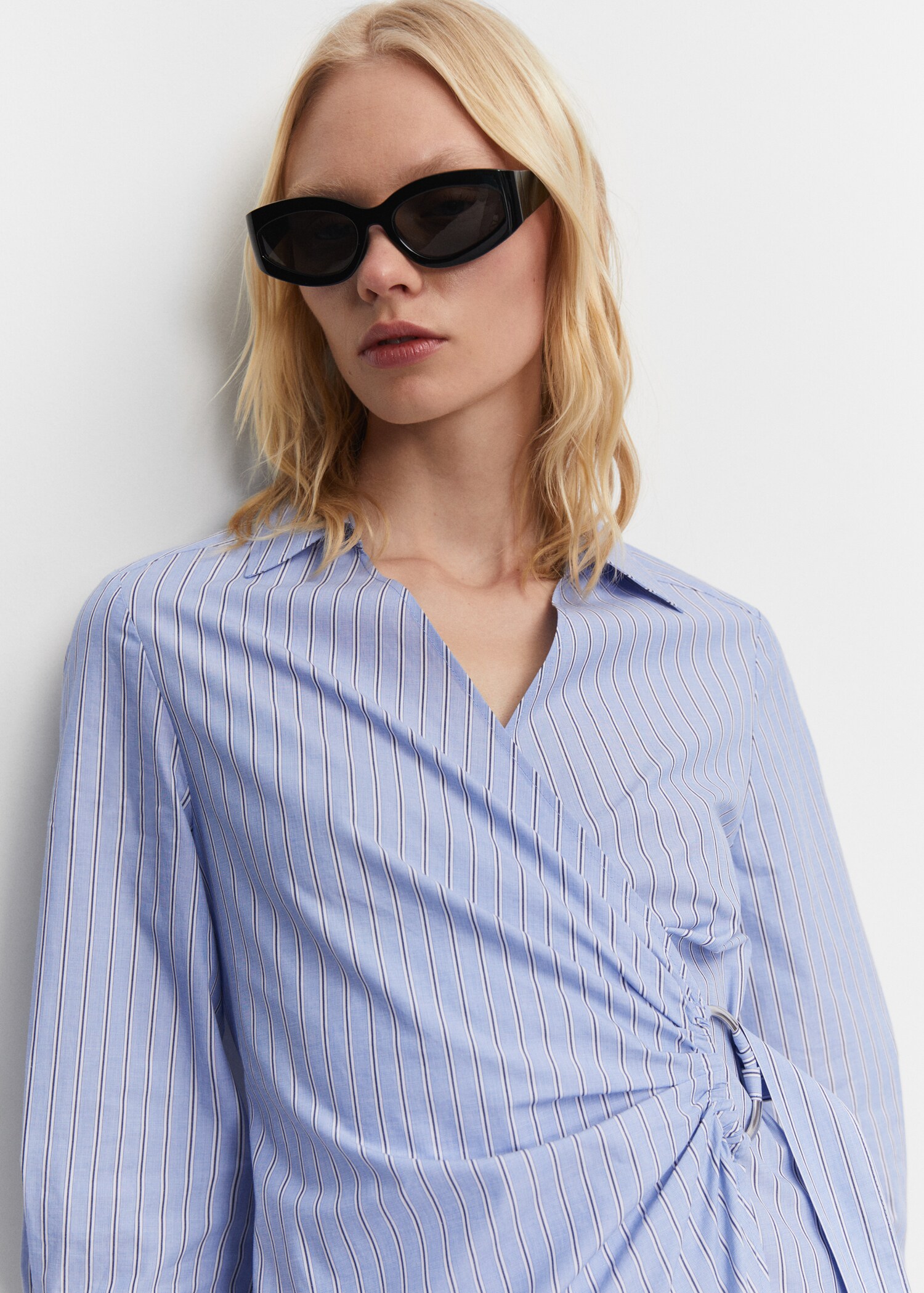 100% cotton fabric. Shirt-style. Striped print. Crossover design. Midi design. Shirt-style V-neck collar. Crossed V-neck. Long buttoned sleeve. Adjustable loop closure. Metallic hoop detail. Office looks.