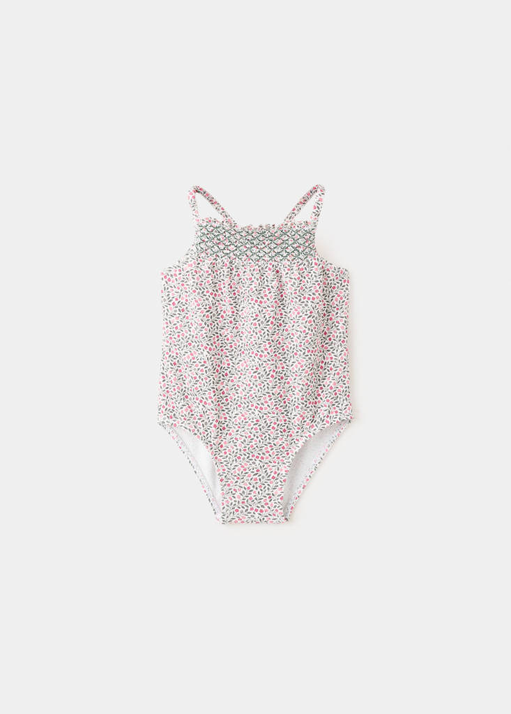 Stretch fabric. Floral-print design. Contrast embroidered details. Crossover straps on the back