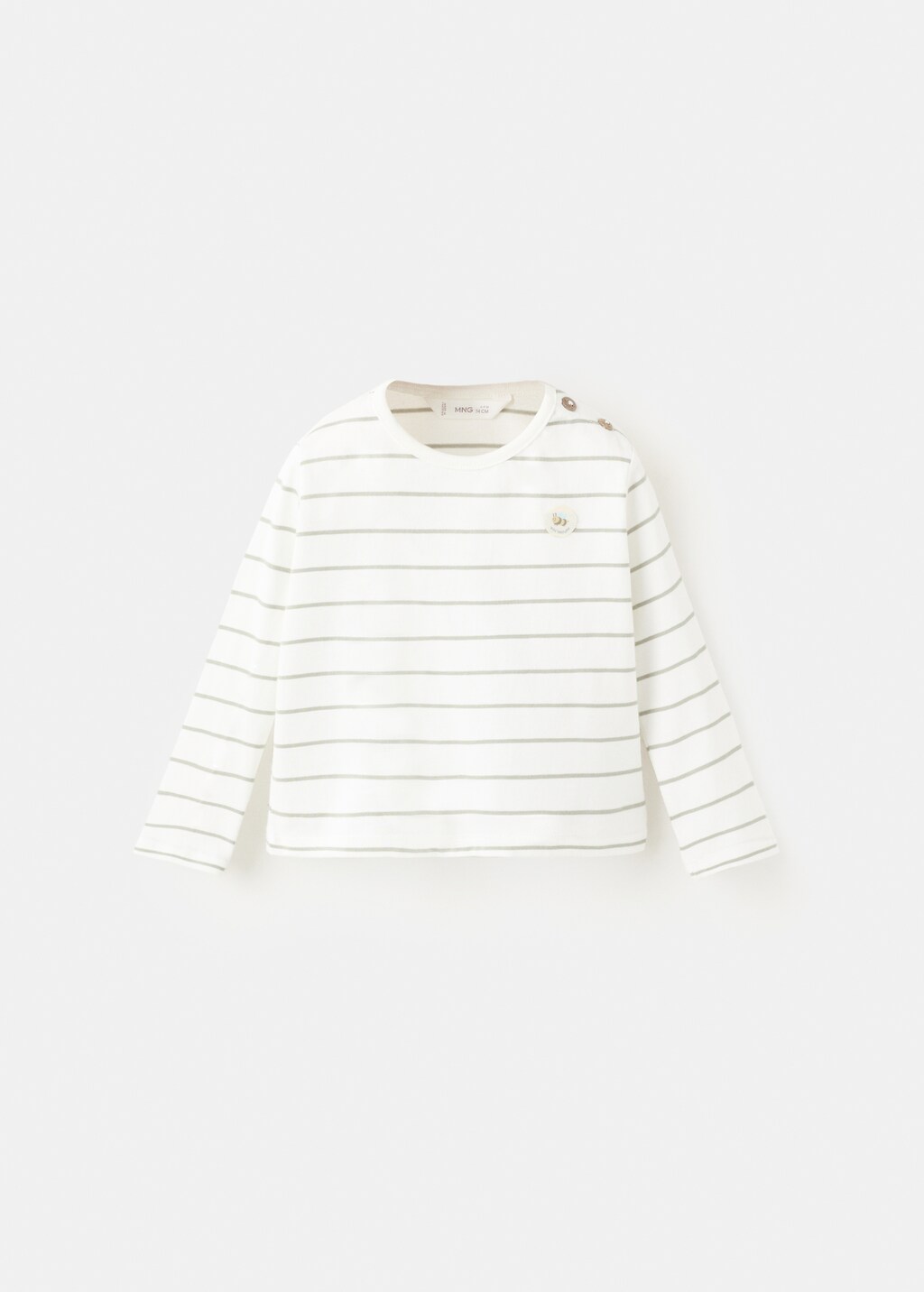 100% cotton fabric. Straight design. Striped print. Round neck. Long sleeve. Decorative patch. Button fastening on the shoulder.