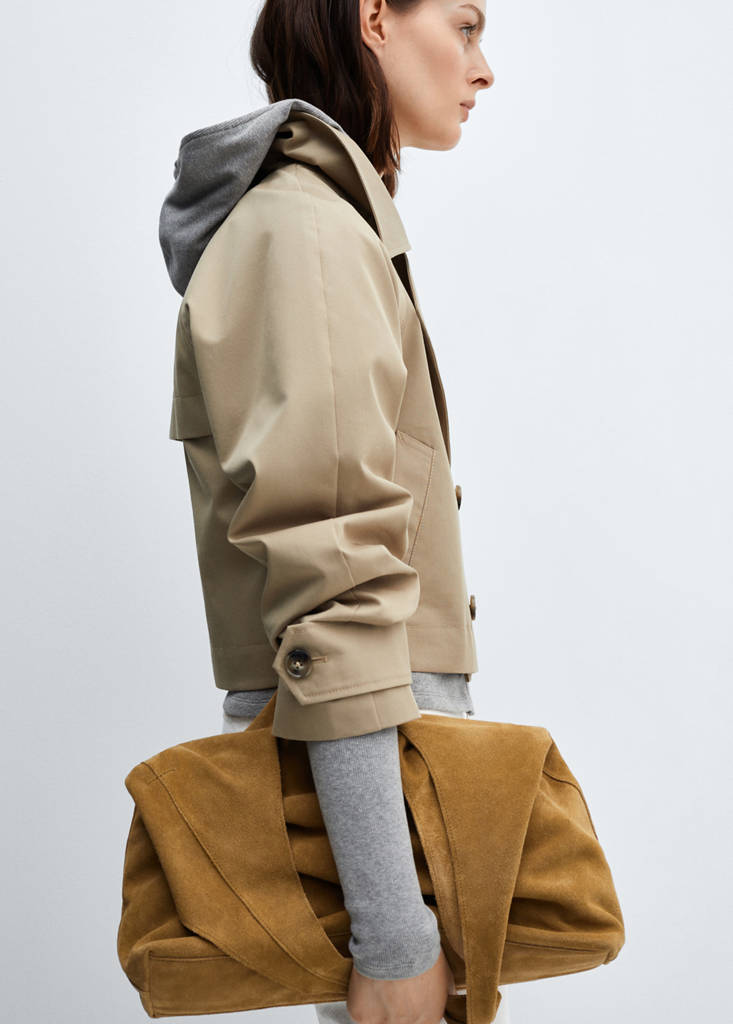 Medium. 100% bovine leather. Suede. Shopper style. Shoulder strap. Main compartment with zip closure. Magnetic button closure. Inner lining