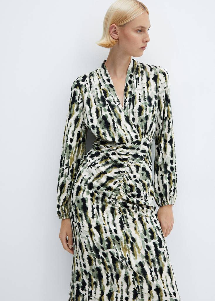 Fluid fabric. Animal print. Long design. Straight design. Crossed V-neck. Long sleeves with elastic cuffs. Button fastening on the back section. Invisible back zip fastening. Gathered detail. Party, ceremony and communion collection. Printed design