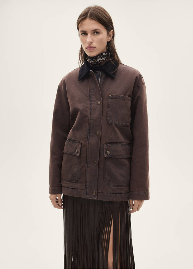 Denim-style cotton fabric. Shirt collar. Long sleeves. Two front flap pockets. Patch pocket on the front. Inner lining. Button fastening at the front. Straight design. Contrast collar