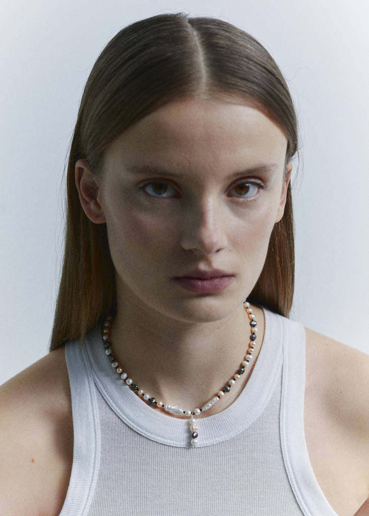 Real pearl. Combined design. Zip and carabiner fastening. 925 silver-plated collection