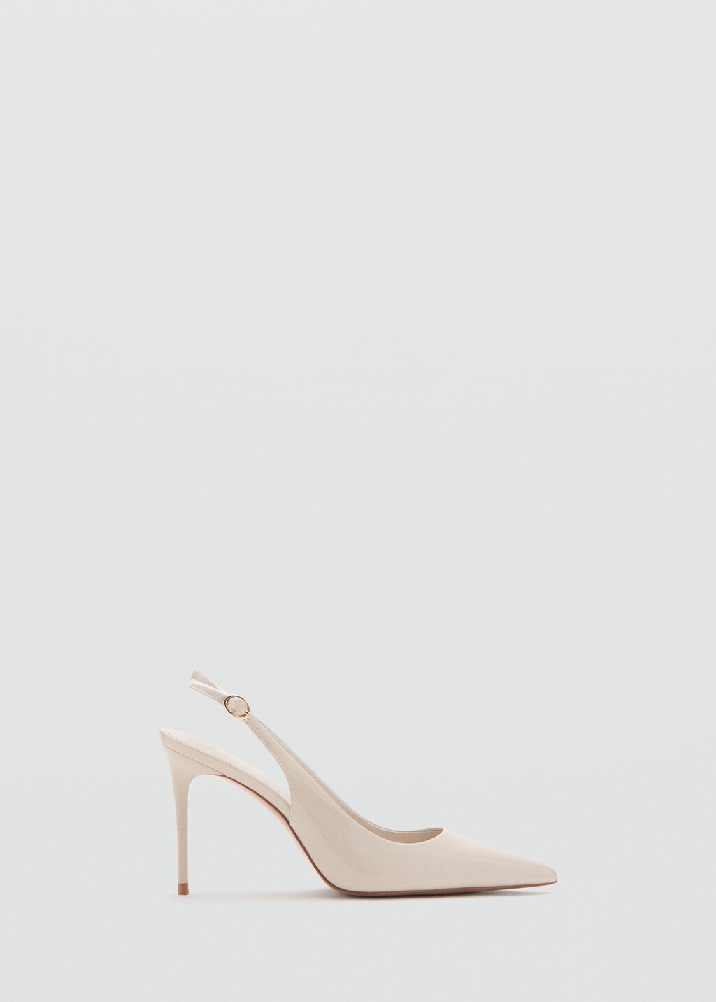 Patent leather effect. Slingback design. Pointed. Stiletto heel. Strap closure with buckle. 10 cm heel