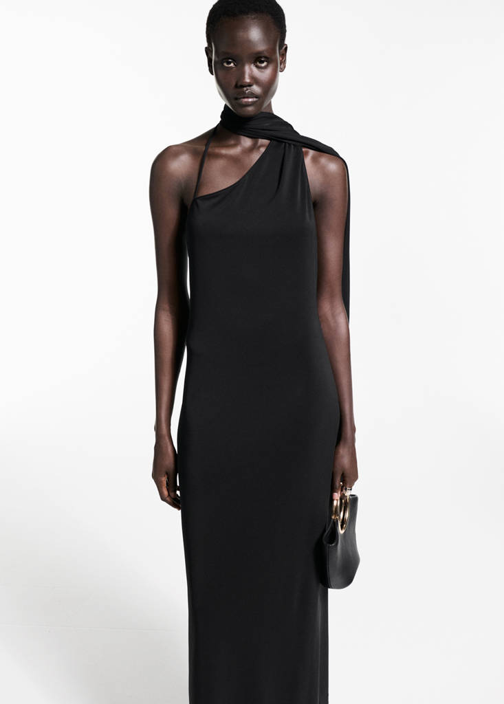 Coupe asymétrique. Tissu fluide. Coupe cintrée. Design long. Col asymétrique. Col en forme de choker. Bretelle fine. Sans fermeture. Fente latérale. Collection fêtes, cérémonie et communion