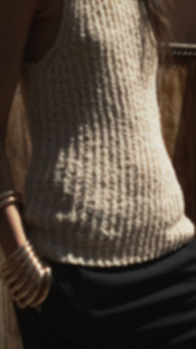 Tissu en grosse maille. Col rond. Sans manches. Bretelle large. Sans fermeture