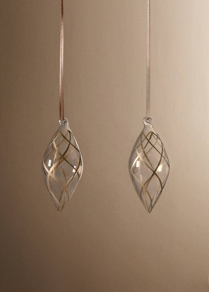 100 % verre. Décoration de Noël. Design transparent. Pack de 2. Inclut un ruban pour la suspendre. Collection Noël. Dimensions : 12x6 cm. Finition dorée peinte à la main. Ajoutez une touche d'élégance et de magie à votre sapin de Noël