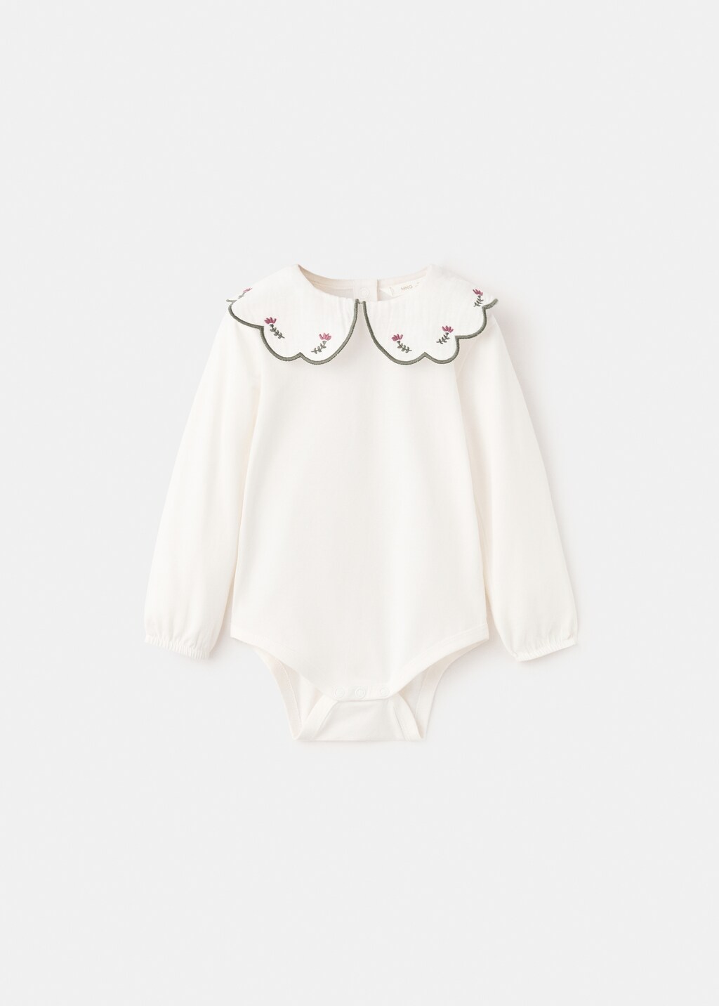 Tissu en coton. Design body. Col claudine. Détail brodé col. Détails à fleurs. Manche longue. Fermeture avant avec boutons. Ouverture à l’arrière avec bouton.