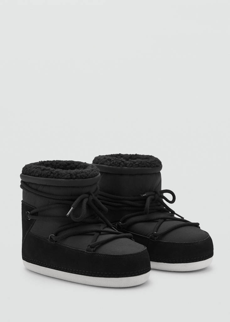 Tissu imperméable. Empiècements en suède. Bout rond. Intérieur moutonnée. Semelle en caoutchouc. Lacets