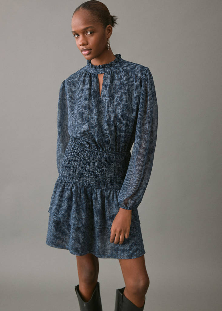 Tissu froncé. Motif imprimé. Design évasé. Coupe courte. Col rond. Manches longues avec poignets élastiques. Détail d'ouverture. Détail de volants. Fermeture par bouton à l'arrière
