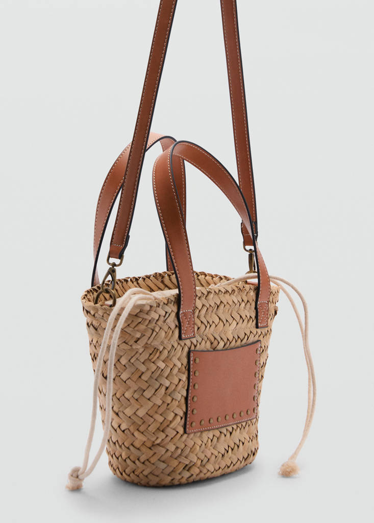 Pour la plage ou la piscine. Tissu en fibre naturelle. Petite taille. Style shopper. Double anse. Anse longue réglable et amovible. Sac intérieur. Fermeture à nœud. Fermeture à bouton magnétique. Détail latéral contrasté