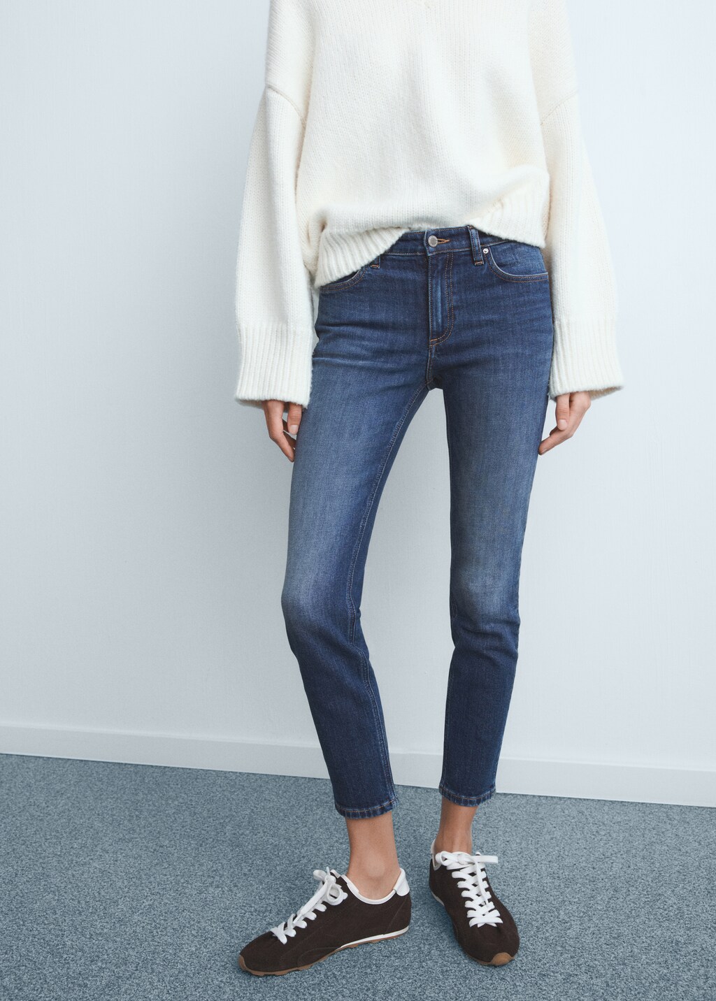 Denim-stijl katoenen stof. Crop ontwerp. Skinny-fit. Middelhoge taille. Riemlussen. Vijf zakken. Rits- en knoopsluiting aan de voorkant. Verkrijgbaar in Plus. Exclusief Online. Binnenlengte 72 cm.