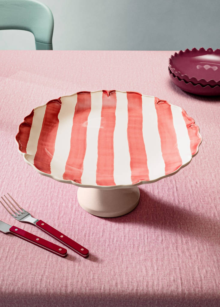 100% aardewerk. Afmeting: 21,5 x 21,5 x 10 cm. Gestreept ontwerp. Golfdetail aan de rand. Taartschaal