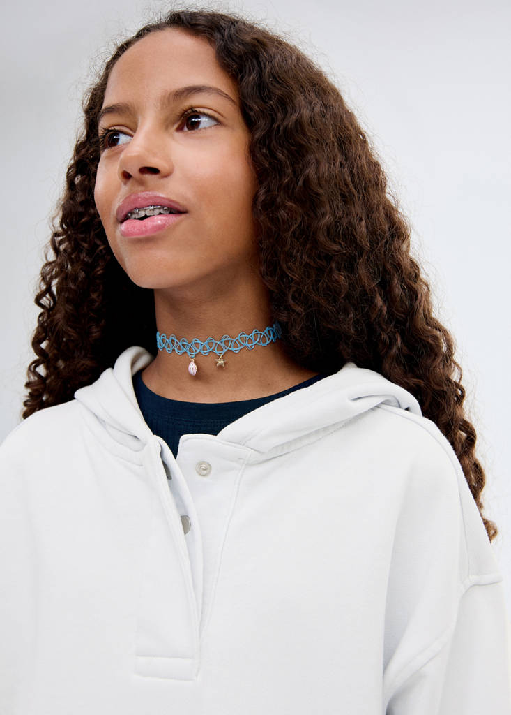 100% katoenen stof. Effen ontwerp. Met capuchon. Voorste knoopsluiting. Lange mouwen. Opgestikte zak aan de voorkant