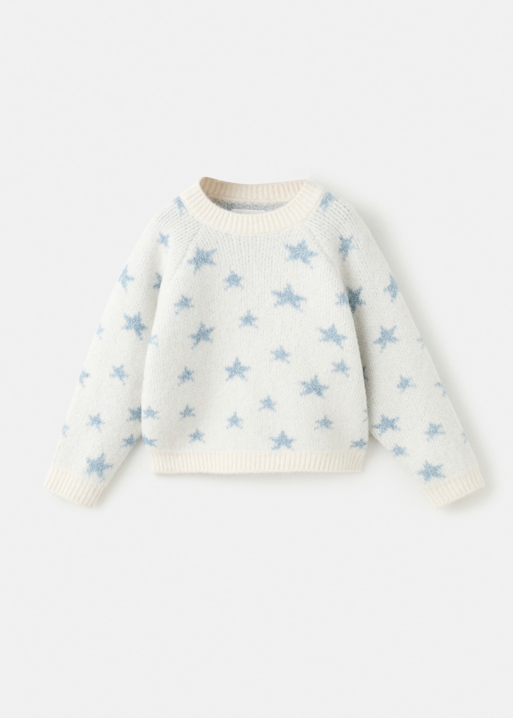 Gebreide stof. Lurex stof. Rechte pasvorm. Sterrenontwerp. Ronde hals. Lange mouwen. Geribbelde kraag, manchetten en zoom.