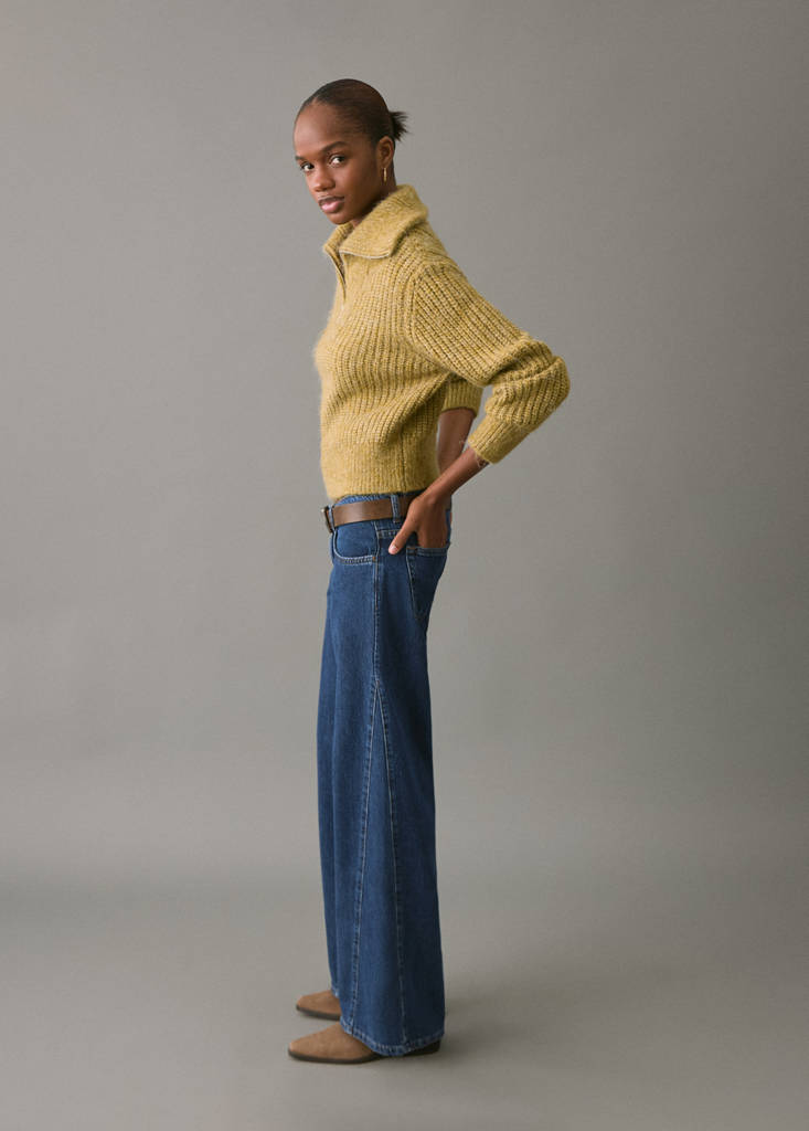 Denimachtige katoenen stof. Middelhoge taille. Recht ontwerp. Lang ontwerp. Sierstiksels. Lussen voor riem. Rits- en knoopsluiting. Twee voorzakken. Twee opgestikte zakken aan de achterkant