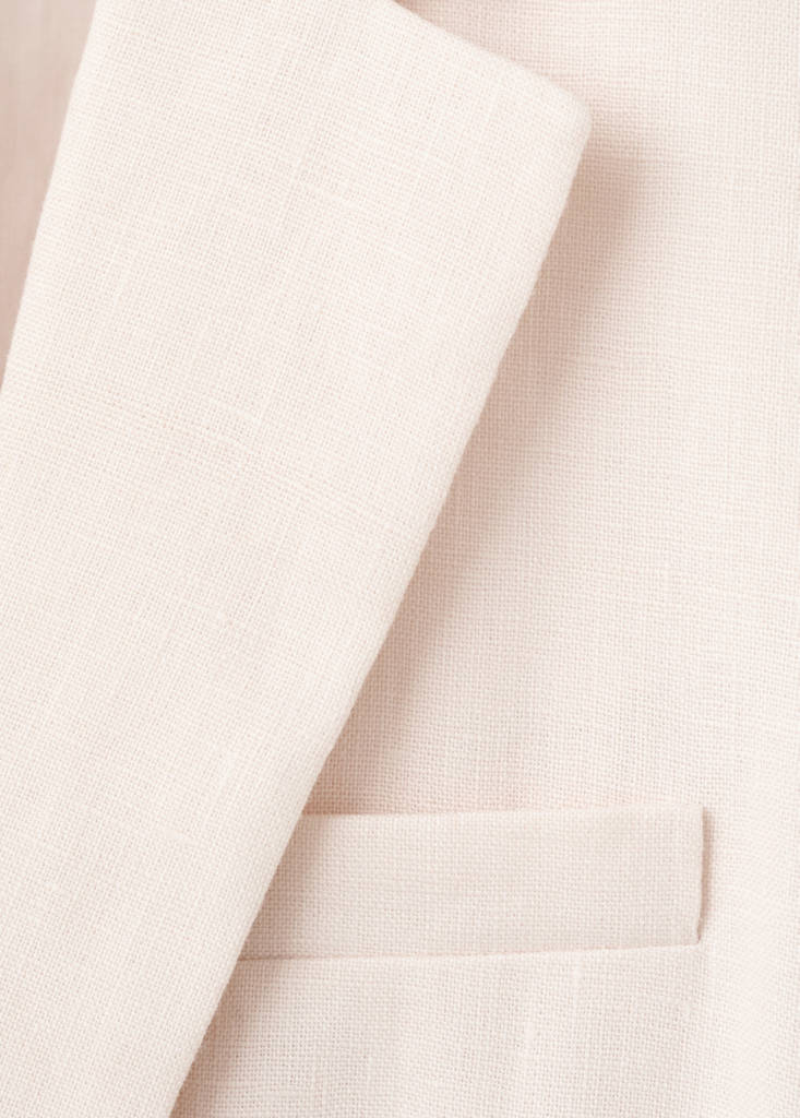 Tissu 100 % lin. Coupe droite. Col en V avec rabat. Revers à encoche. Manches longues et poignets boutonnés. Deux poches passepoilées à l’avant. Ouverture arrière en bas. Fermeture à bouton sur le devant. Doublure intérieure. Total look. Disponible Plus.