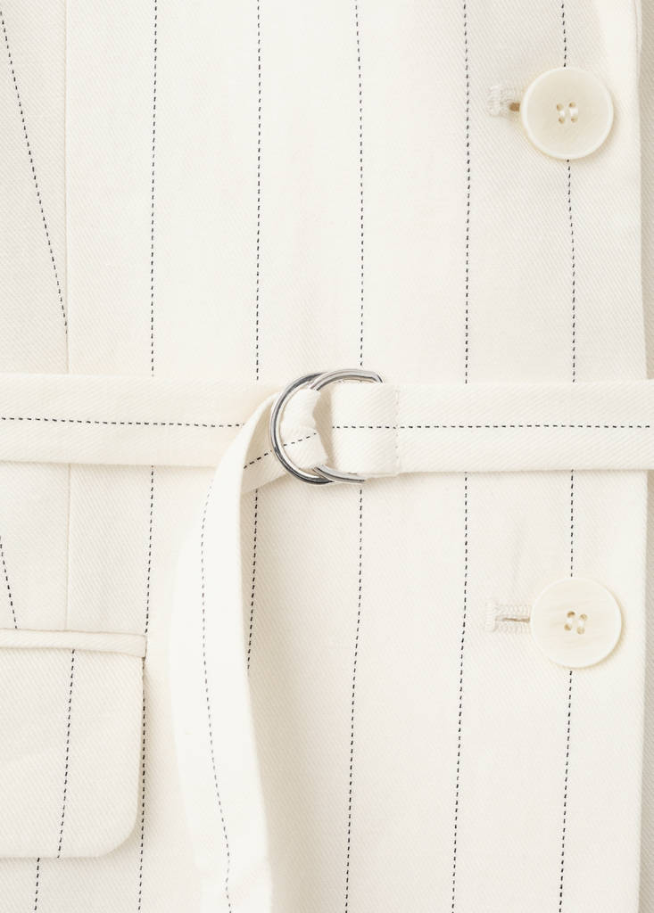Tissu en lin mélangé. Coupe droite. Col en V avec rabat. Manches trois-quarts. Revers à encoche. Deux poches à rabat. Fermeture avant avec boutons. Détail ceinture à la taille. Total look.