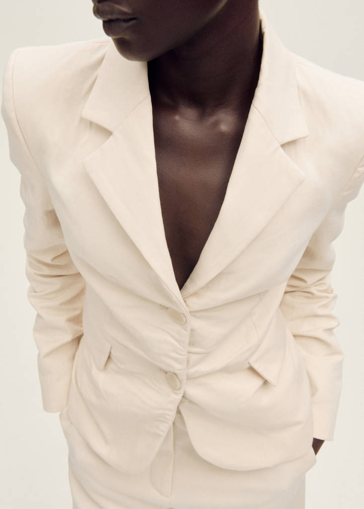 Tissu mélange de coton et lin. Style tailleur. Coupe droite. Col en V avec rabat. Revers à encoche. Manches longues et poignets boutonnés. Deux poches à rabat sur les côtés. Fermeture avant avec boutons. Ouverture arrière en bas. Doublure intérieure. Total look. Collection Selection.
