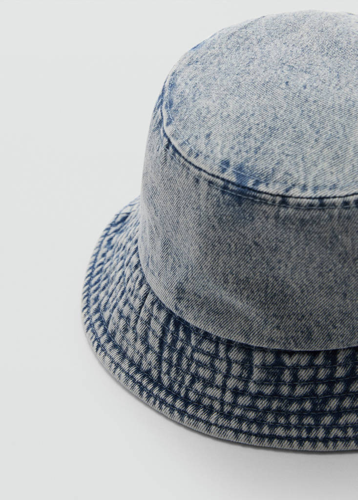 Tissu en coton style denim. Forme bob. Effet usé. Sans fermeture. Doublure. Saison des festivals.
