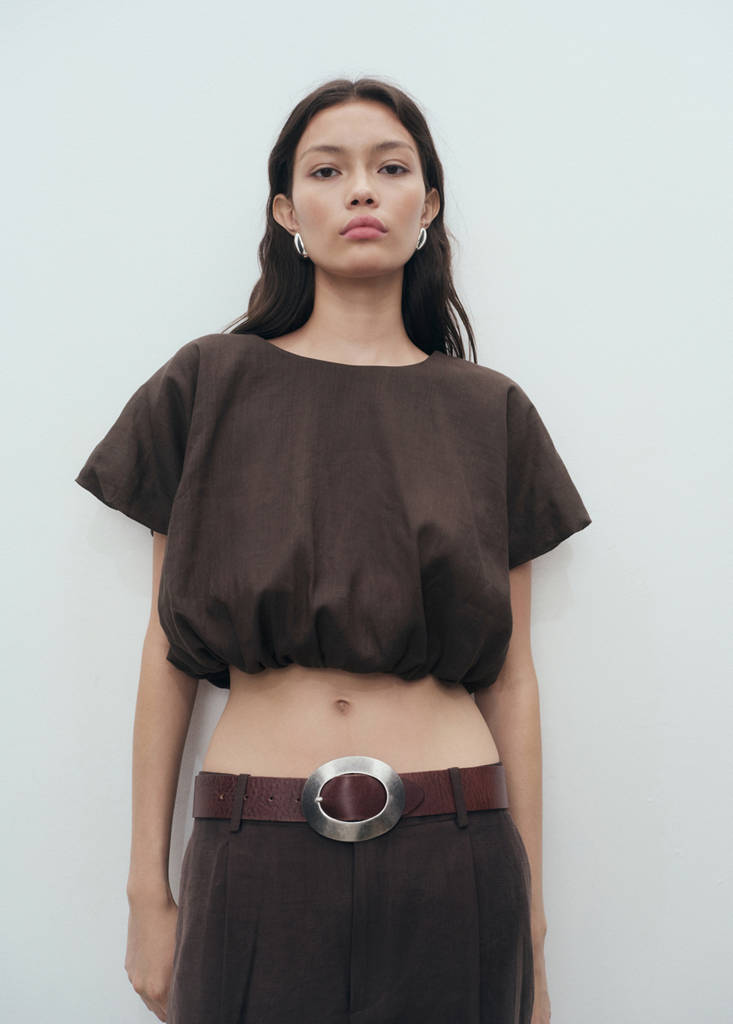 Fabriqué à partir d'un mélange de ramie et de coton, ce vêtement présente un design court de style ballon. Le col rond et les manches courtes bouffantes complètent sa structure, ce qui en fait une pièce essentielle pour celles qui recherchent un équilibre entre structure et fluidité