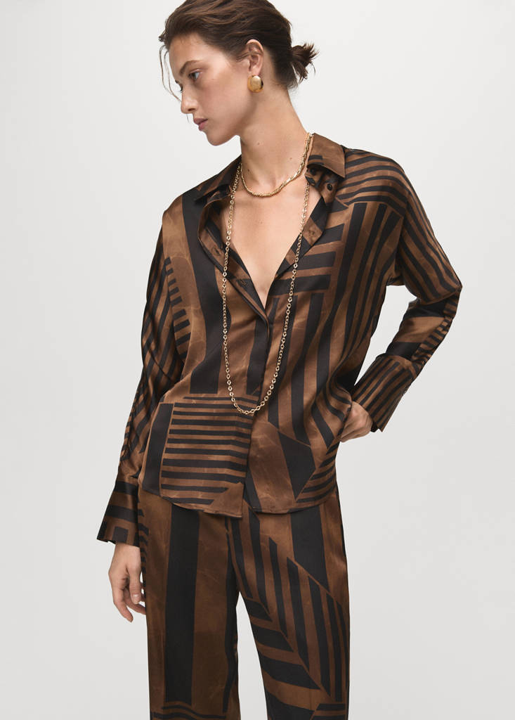 Confectionné dans un tissu satiné, ce vêtement présente une coupe droite avec un imprimé à rayures combinées. Comprend un col chemise et des manches longues à poignets boutonnés. Il est accompagné d’un pantalon assorti