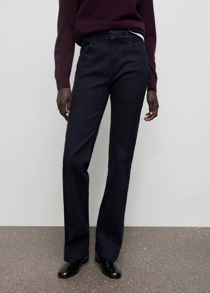 Tissu en coton style denim. Design long. Style flare. Taille mi-haute. Passants de ceinture. Cinq poches. Zip, button and concealed hook-and-loop fastener with placket. Tissu confort élastique.