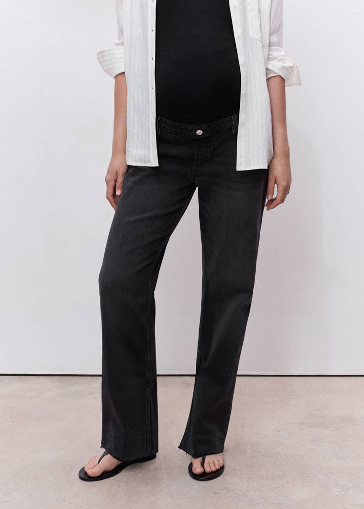 Tissu en coton style denim. Design long. Coupe droite. Taille basse. Taille élastiquée. Bande élastique en maille à la taille pour plus de confort et un maintien optimal. Passants de ceinture. Cinq poches. T-shirt coton bio poche. Bas effiloché. Sans fermeture. Grossesse. Offre confort et liberté de mouvement. Blouson biker effet usé. Exclusivité en ligne. Tissu confort élastique.