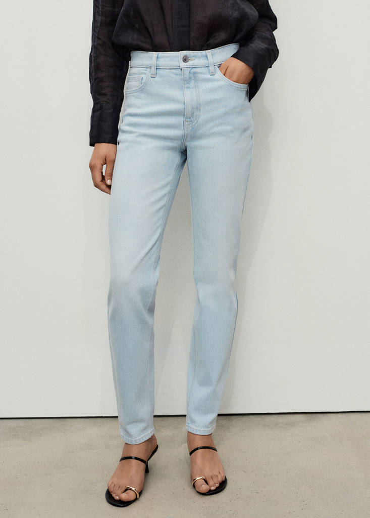 Tissu en coton style denim. Tissu élastique. Mom-fit. Taille haute. Passants de ceinture. Cinq poches. Fermeture Éclair et bouton à l’avant. Longueur intérieure 70 cm. Disponible Plus. Tissu confort élastique.