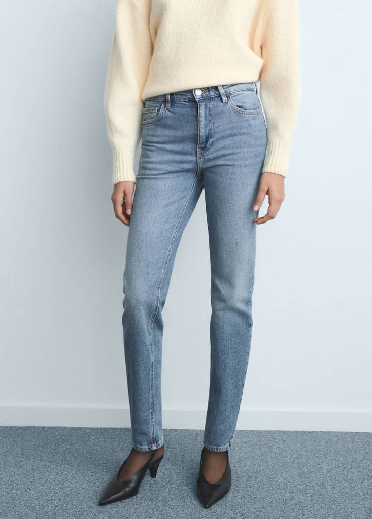 Tissu en coton style denim. Tissu élastique. Mom-fit. Bracelet de cheville. Taille haute. Passants de ceinture. Cinq poches. Fermeture Éclair et bouton à l’avant. Longueur intérieure 70 cm. Disponible Plus. Fermeture éclair et bouton.