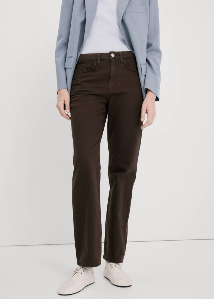 Tissu en coton style denim. Design long. Coupe droite. Taille mi-haute. Passants de ceinture. Cinq poches. Fermeture par bouton et zip. Longueur intérieure 80 cm.