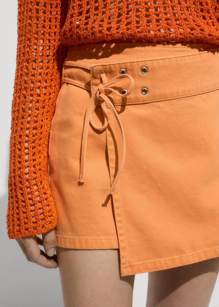 Tissu en coton style denim. Taille basse. Coupe droite. Coupe croisée. Deux poches passepoilées à l'arrière. Fermeture nœud croisé. Fermeture Éclair invisible à l'arrière.