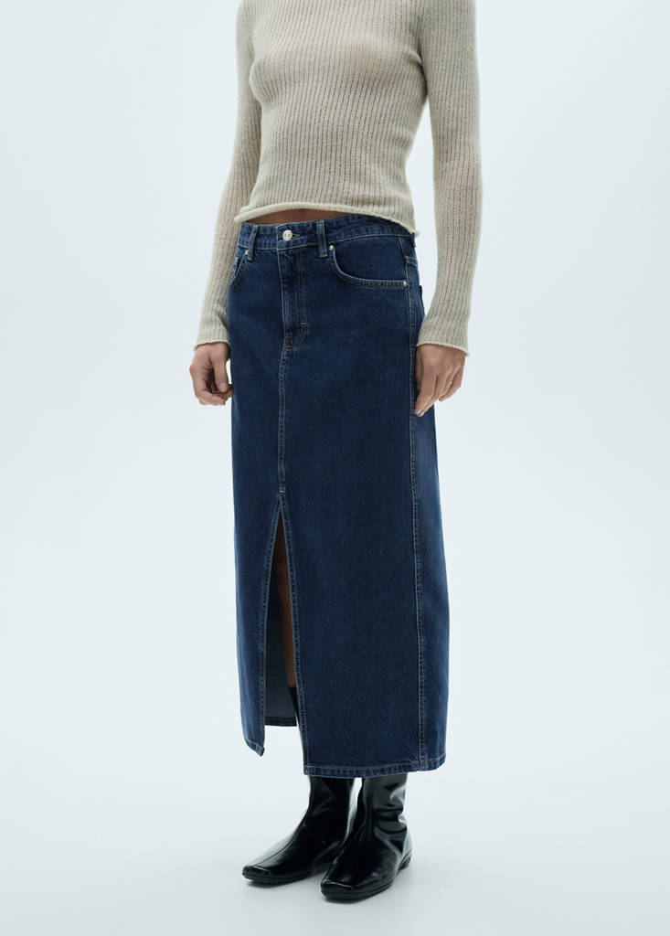 Tissu en coton style denim. Coupe midi. Coupe droite. Passants de ceinture. Cinq poches. Fermeture éclair et bouton. Ouverture en bas à l'avant.