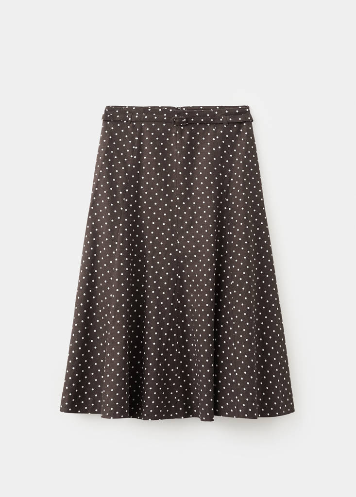 Tissu en lin mélangé. Design évasé. Coupe midi. Imprimé à pois. Détail ceinture à la taille. Taille mi-haute. Fermeture éclair au dos. Doublure intérieure. Total look.