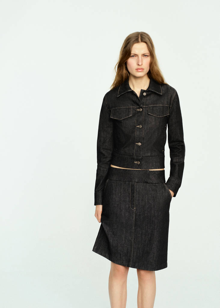 Tissu en coton style denim. Coupe droite. Coupe midi. Détail d'ouverture à l'arrière. Taille basse. Deux poches latérales. Fermeture dissimulée par crochets et zip. Total look.