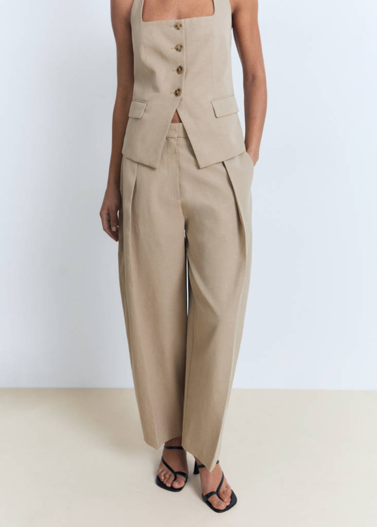 Tissu mélange de coton et lin. Style tailleur. Design ballon. Taille mi-haute. Pinces. Deux poches latérales. Deux poches passepoilées à l'arrière. Fermeture Éclair avec agrafe et bouton dissimulés. Doublure intérieure 100% coton. Total look. La couleur rouge est exclusivement disponible en ligne.