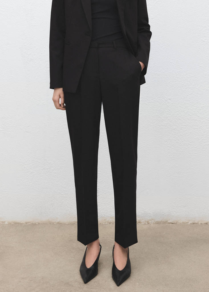 Coupe droite. Style tailleur. Taille mi-haute. Passants de ceinture. Deux poches latérales. Deux poches passepoilées à l'arrière. Fermeture Éclair avec agrafe et bouton dissimulés. Disponible Plus. Total look.