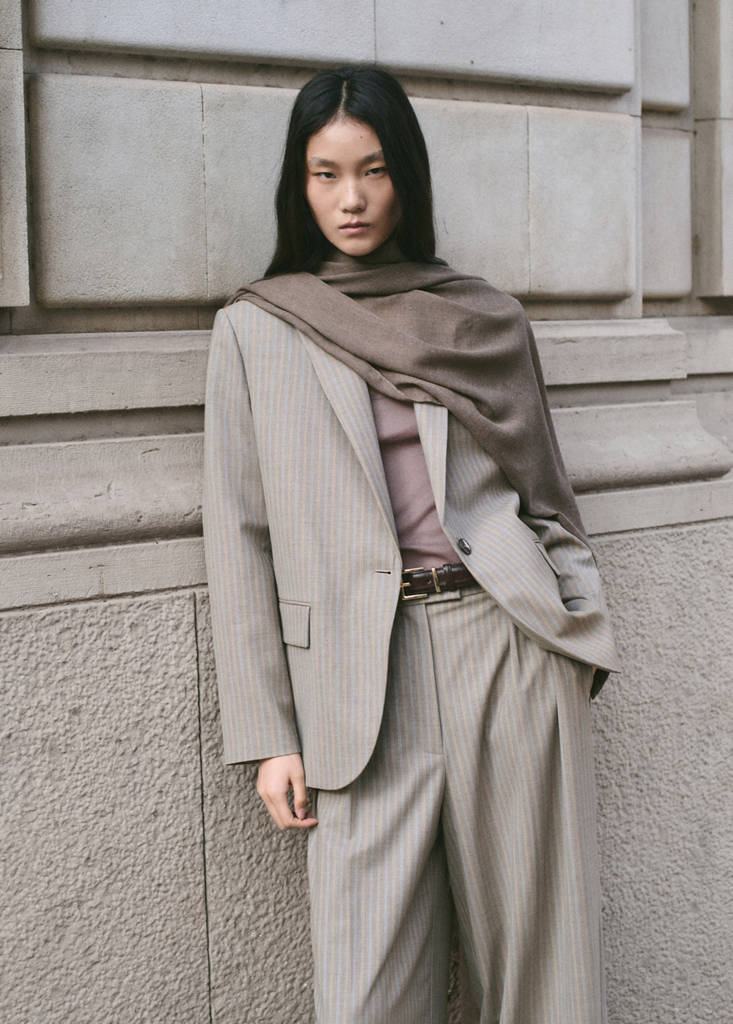 Tissu de laine mélangé. Coupe droite. Imprimé rayures. Pinces. Deux poches latérales. Taille basse. Passants de ceinture. Fermeture avant par bouton, crochet et zip caché sous patte. Total look.