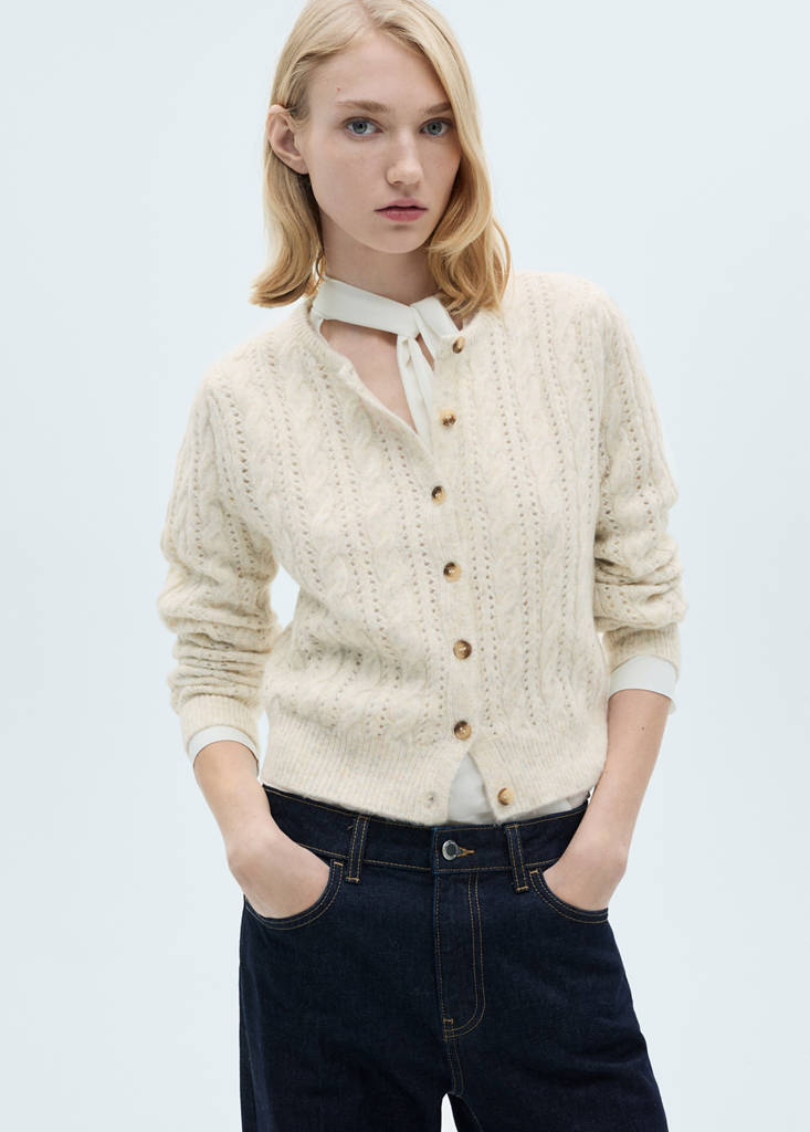 Tissu en grosse maille. Tissu maille torsadée. Tissu ajouré. Coupe droite. Col rond. Manche longue. Fermeture à boutons sur le devant. Disponible en grande taille