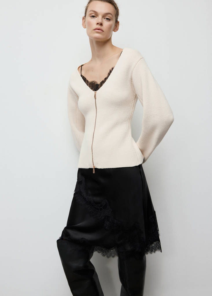Tissu en maille moyenne. Design ajusté. Col en V. Manche longue. Fermeture Éclair à l’avant.