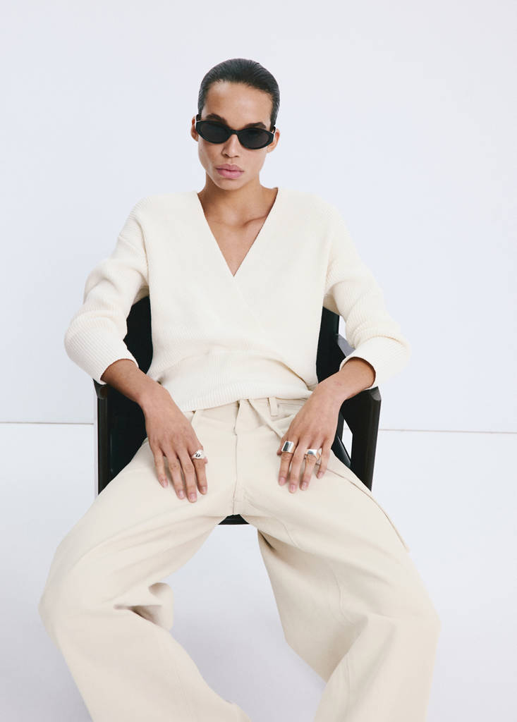 Tissu mélange de coton. Design côtelé. Coupe ajustée. Col en V croisé. Manche longue. Sans fermeture.