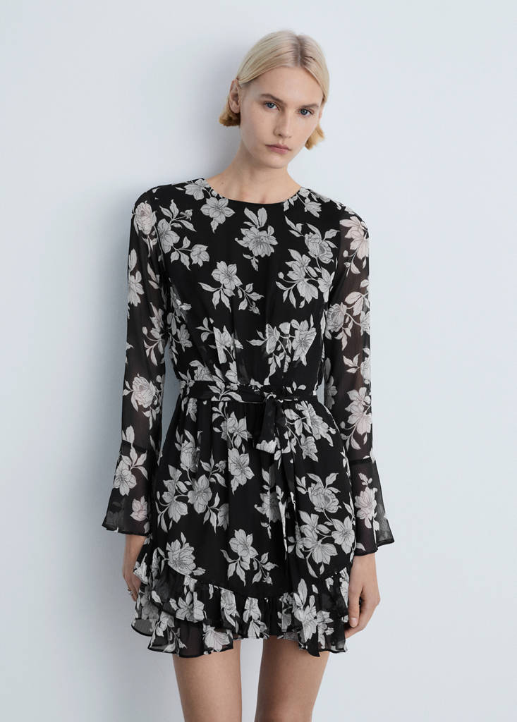 Coupe courte. Design évasé. Imprimé floral. Col rond. Manches longues cloche. Ceinture à nouer à la taille. Ourlet à volants. Fermeture par bouton à l'arrière. Doublure intérieure.