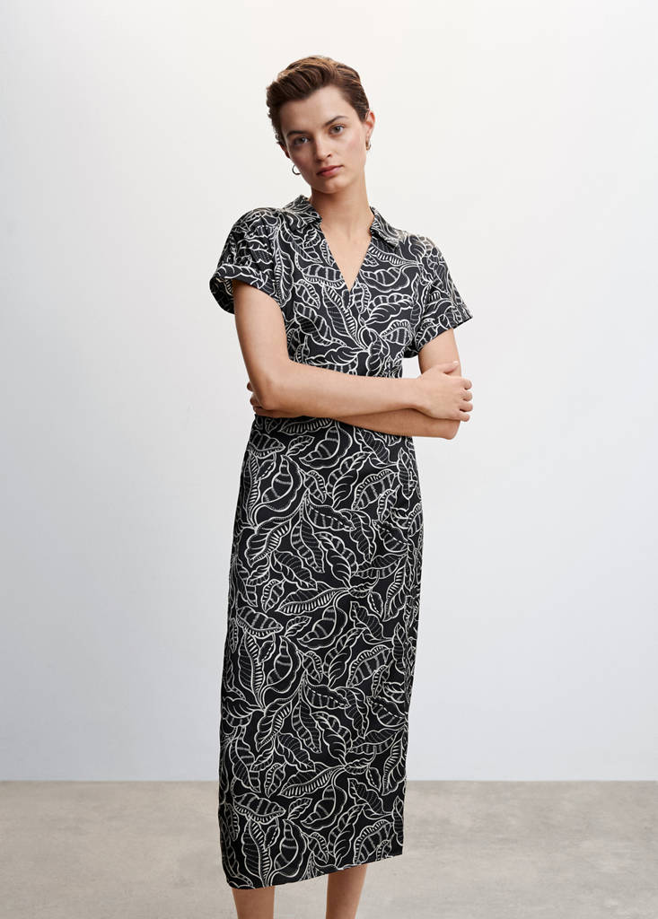 Tissu fluide. Croisé. Coupe droite. Coupe midi. Imprimé. Col chemise. Manches courtes retournées. Fermeture latérale à nœuds. La couleur verte est une exclusivité en ligne. Disponible Plus.