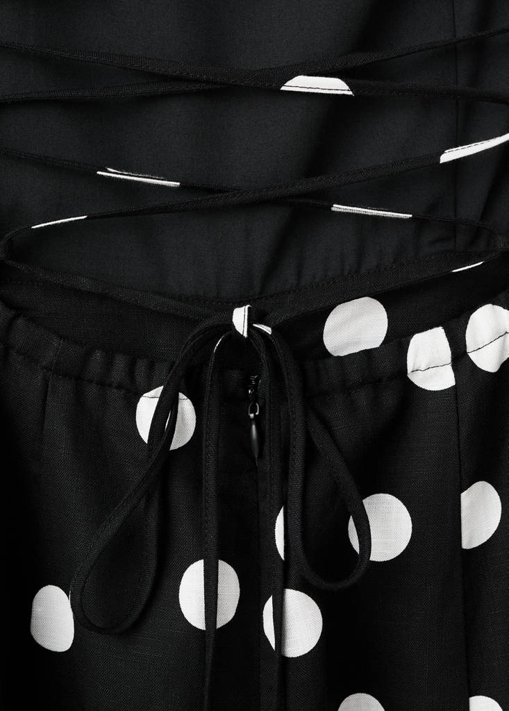 Tissu de lin et Lyocell mélangés. Design évasé. Design long. Imprimé à pois. Col halter. Sans manches. Fermeture éclair au dos. Fermeture à nouer au dos. Total look. Doublure intérieure.