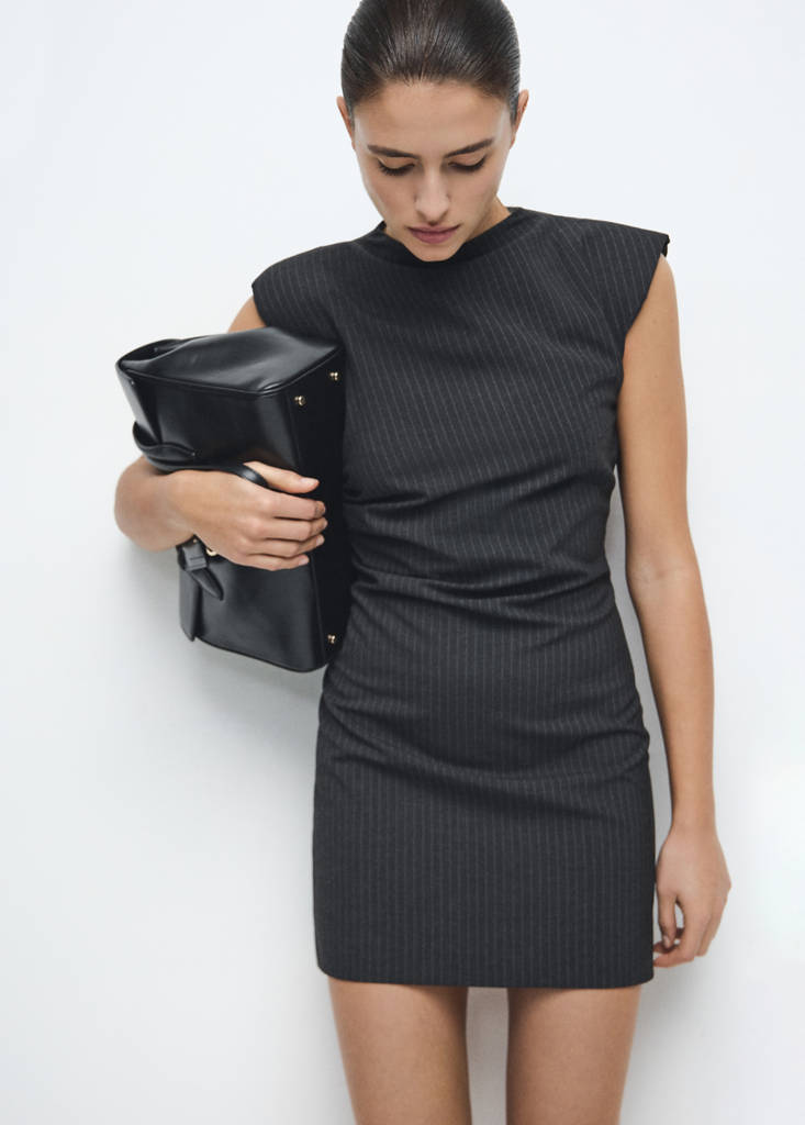 Coupe courte. Coupe droite. Fines rayures. Détail cut out. Col Perkins. Bretelles. Fermeture éclair au dos. Doublure intérieure.