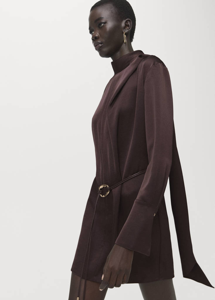 Tissu satiné. Coupe courte. Coupe droite. Col montant. Manche longue. Empiècement foulard sur le col. Ceinture décorative. Fermeture éclair au dos. Exclusivité en ligne. Ce vêtement fait partie de notre collection de fête et d'événement, conçue pour sublimer vos looks lors d'occasions spéciales.