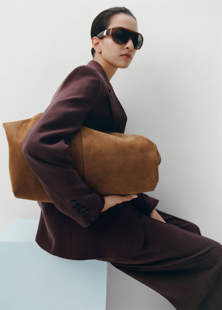 Grande taille. 100 % cuir bovin. Suède. Détail surpiqué. Anse d'épaule. Portefeuille intégré. Fermeture à bouton métallique. Doublure intérieure. Exclusivité en ligne.