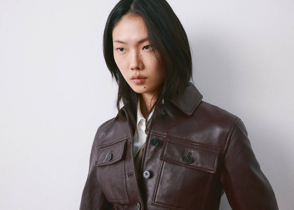 100% cuir d'agneau. Coupe ajustée. Col chemise. Manche longue. Deux poches plaquées à rabat sur la poitrine. Fermeture avant avec boutons.